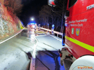 Der Erste war zum einen schwer zu erreichen, da er zwischen Esch und Niederems oberhalb einer steilen Felsböschung lag, tief im Wald und das bei Nacht. Hierzu wurde der Kreisbrandmeister verständigt, die Drohne aus Wüstems kam zum Einsatz, die B275 wurde von der Kreuzung Esch bis Niederems voll gesperrt. Der Einsatz dauerte gute 2 Stunden an.
