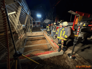 Im weiteren Verlauf der Nacht wurde dann noch einmal die gesamte Wehr alarmiert. Diesmal galt es übergelaufene Betriebsstoffe aus einem der Transporter zu binden und aufzunehmen. Dieser Einsatz war nach etwa einer Stunde beendet. Fast zeitgleich hatten die beiden Schwertransporte die Engstelle passiert.