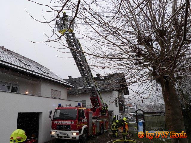 Um 06:45 Uhr wurden alle Waldemser Wehren zu einem Zimmerbrand nach Steinfischbach alarmiert. Noch bevor wir an der Einsatzstelle angekommen waren wurde die Rückmeldung gegeben, dass es sich nicht nur um einen Zimmerbrand sondern um einen Dachstuhlbrand handelt. Die beiden Bewohnerinnen des Gebäudes konnten sich noch vor dem Eintreffen der Rettungskräfte selbst retten. Schnell wurden die Drehleitern aus Idstein und Bad Camberg nachalarmiert. Atemschutzgeräteträger wurden unter Umluft unabhängigem Atemschutz im und am Gebäude eingesetzt. Im Laufe des Einsatzes wurden weitere Kräfte alarmiert um die Bereitstellung an Atemschutzgeräteträgern sicher zu stellen. In kurzer Folge wurden weitere Kräfte aus Weilrod-Riedelbach und der Katastrophenschutzzug aus Hünstetten nachalarmiert. Durch starken Schneefall wurden die Löscharbeiten erschwert. Da sich abzeichnete, dass es ein längerer Einsatz werden wird, wurden die Einsatzkräfte vom Betreuungszug des ASB Taunusstein am Gerätehaus in Steinfischbach verpflegt. Das Gerätehaus in Waldems-Esch wurde nachbesetzt um aufgebrauche Atemluftflaschen zu füllen und trockene Ersatzkleidung an die Einsatzstelle zu bringen. Bürgermeister Markus Hies kam an die Einsatzstelle und machte sich ein Bild von der Schadenslage. In der Spitzenzeit des Einsatzes waren über 120 Einsatzkräfte vor Ort. Die Kreisbrandmeister des Rheingau-Taunus-Kreises unterstützten die Führungskräfte vor Ort. Der Rettungsdienst war mit 2 Rettungswagen und 1 Notarzteinsatzfahrzeug vor Ort in Bereitschaft, die Polizei Idstein war mit mehreren Kräften an der Einsatzstelle. Um 13:00 Uhr konnten wir dann auch mit dem Einsatzleitfahrzeug die Einsatzstelle verlassen. Bis auf eine verletzte Einsatzkraft konnten alle Einsatzkräfte unversehrt die Fahrt in die Unterkunft antreten. Die Bewohnerinnen des Gebäudes konnten in anderen Wohnungen unterkommen, da das Gebäude nicht mehr bewohnbar ist.