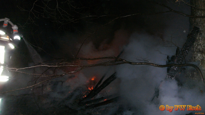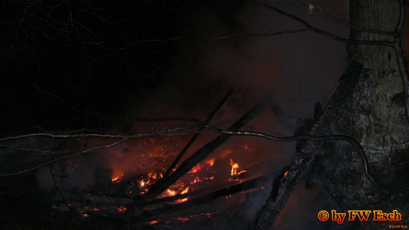 Brandeinsatz, es brannte ein Bienenhaus im Wald. Beim Eintreffen der Feuerwehr stand das Haus bereits im Vollbrand.
