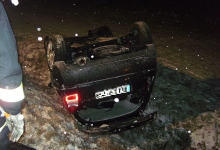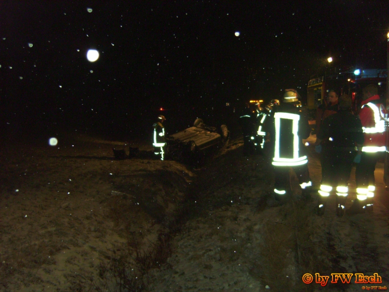 PKW liegt auf dem Dach im Feld, zum Zeitpunkt des Unfalls herschte Straßenglätte. Beim Eintreffen der Feuerwehr keine Person mehr eingeklemmt. Es wurde nur noch die Batterie abgeklemmt.